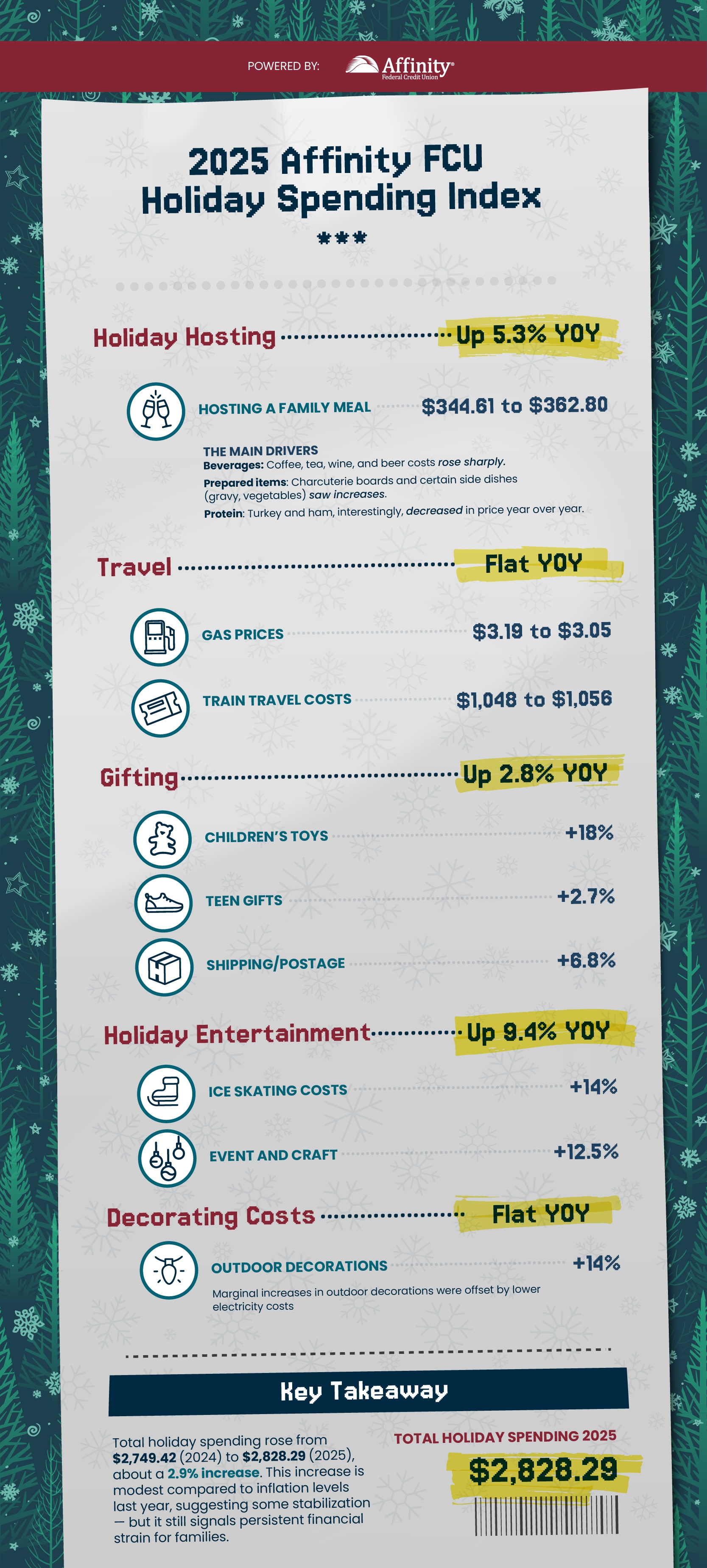 The holiday season brings family time, treasured traditions, and winter fun - but high costs can put a damper on festive cheer. Affinity’s 2025 Holiday Spending Index shows that the total cost of celebrating the season, from Thanksgiving dinner through New Year’s, rose 2.87% since last year. The average family of four will spend $2,828 this year, including travel, gifting, and family activities.